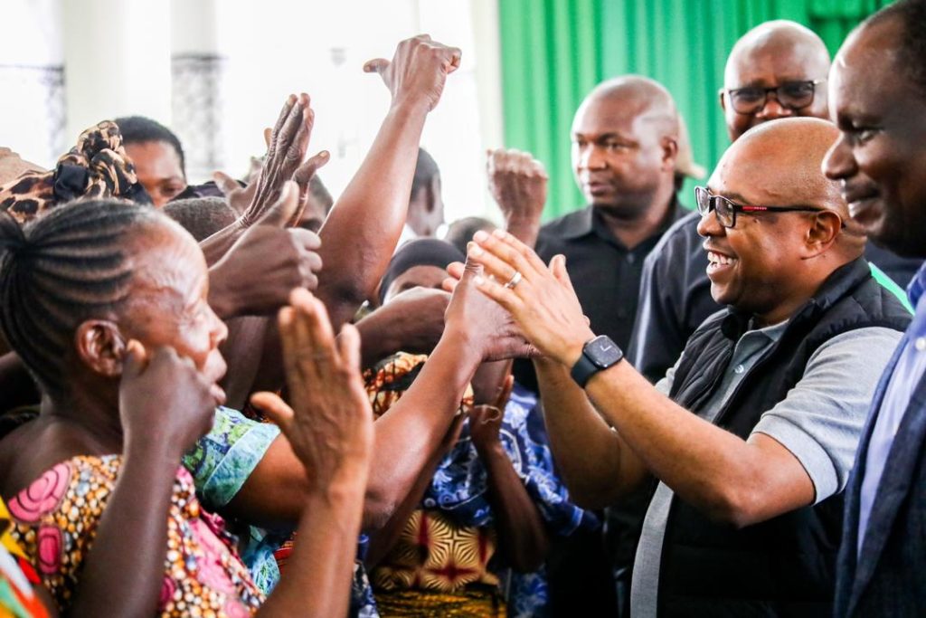 Naibu Waziri wa Nchi Ofisi ya Rais, Menejimenti ya Utumishi wa Umma na Utawala Bora, Mhe. Ridhiwani Kikwete akisalimiana na baadhi ya walengwa wa Mpango wa Kunusuru Kaya Maskini katika Manispaa ya Musoma mkoani Mara mara baada ya kuzungumza nao wakati wa ziara yake ya kikazi ya kukagua utekelezaji wa miradi ya TASAF mkoani Mara.